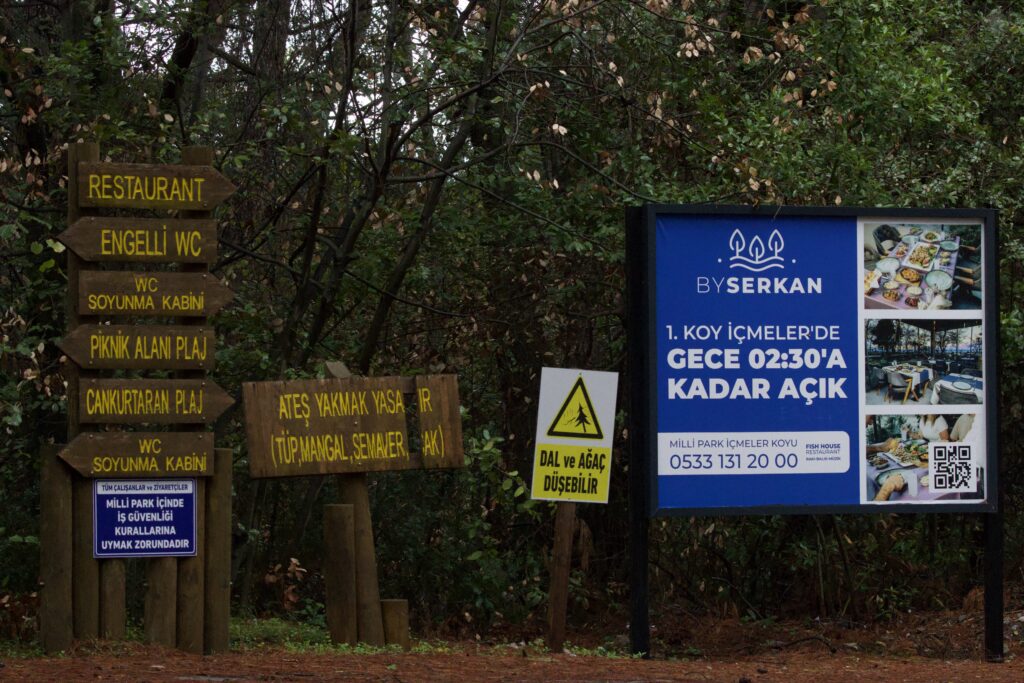 Ayrıca Doğa Koruma ve Milli Parklar Genel Müdürlüğü tarafından alana yerleştirilen “1. Derece Yangına Hassas Bölge”ve “Ziyaretçilerin Milli Parkı En Geç Saat 18.00’de Boşaltmaları Gerekmektedir” ibareli uyarı tabelalarının hemen ilerleyen bölümlerinde, işletmelere ait “Masa Izgara – KG ile Pişirme” ve “Gece 02.30’a Kadar Açık” ifadelerini içeren tabelaların bulunması, sahadaki uygulamalar ile kurumun kendi uyarı ve koruma politikaları arasında açık bir çelişki olduğunu göstermektedir.